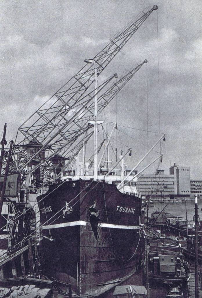 De wipkranen reiken over de 'Touraine' heen naar de lichters langszij.