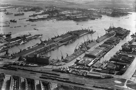 Een verwoeste havenkraan in de Lekhaven, 1944.