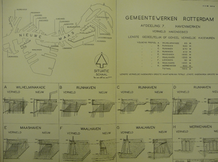 Lengte vernielde kademuren in Rotterdams havengebied. In de Lekhaven is 90 meter vernield.