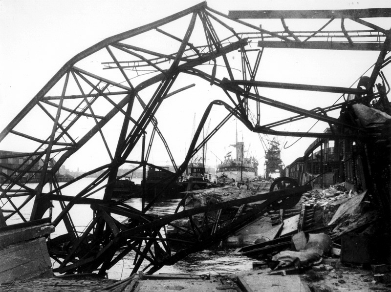 Een verwoeste havenkraan in de Lekhaven na het opblazen door de Duitsers in september 1944.